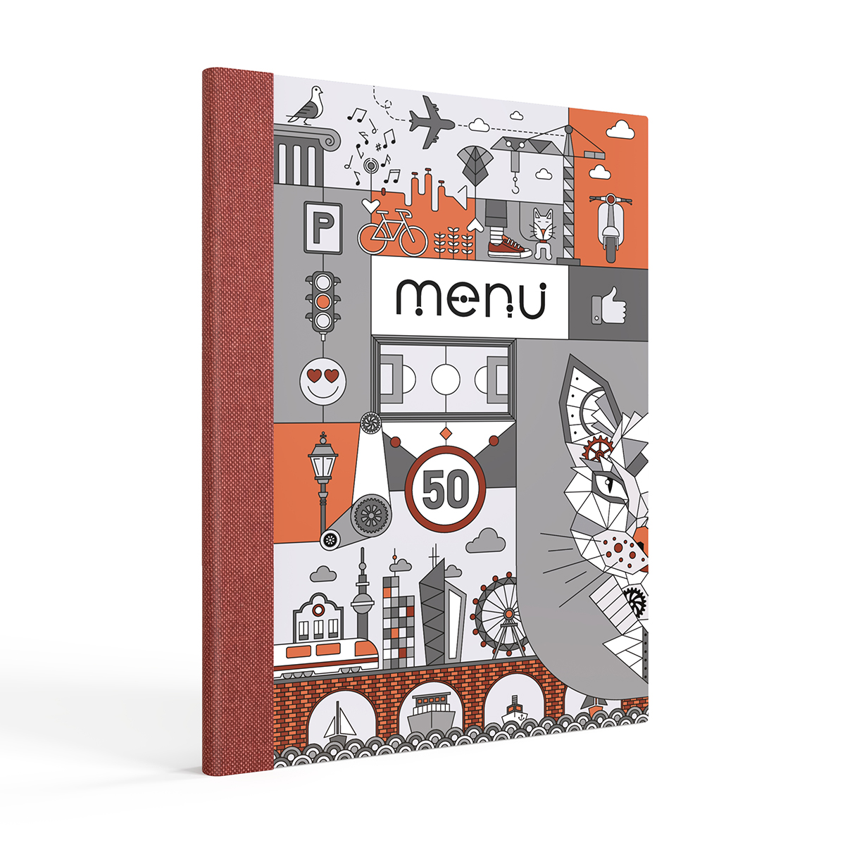 Menu Holder covered with digital printing and leather on the back, in dimension A4 (22cm X 32cm)