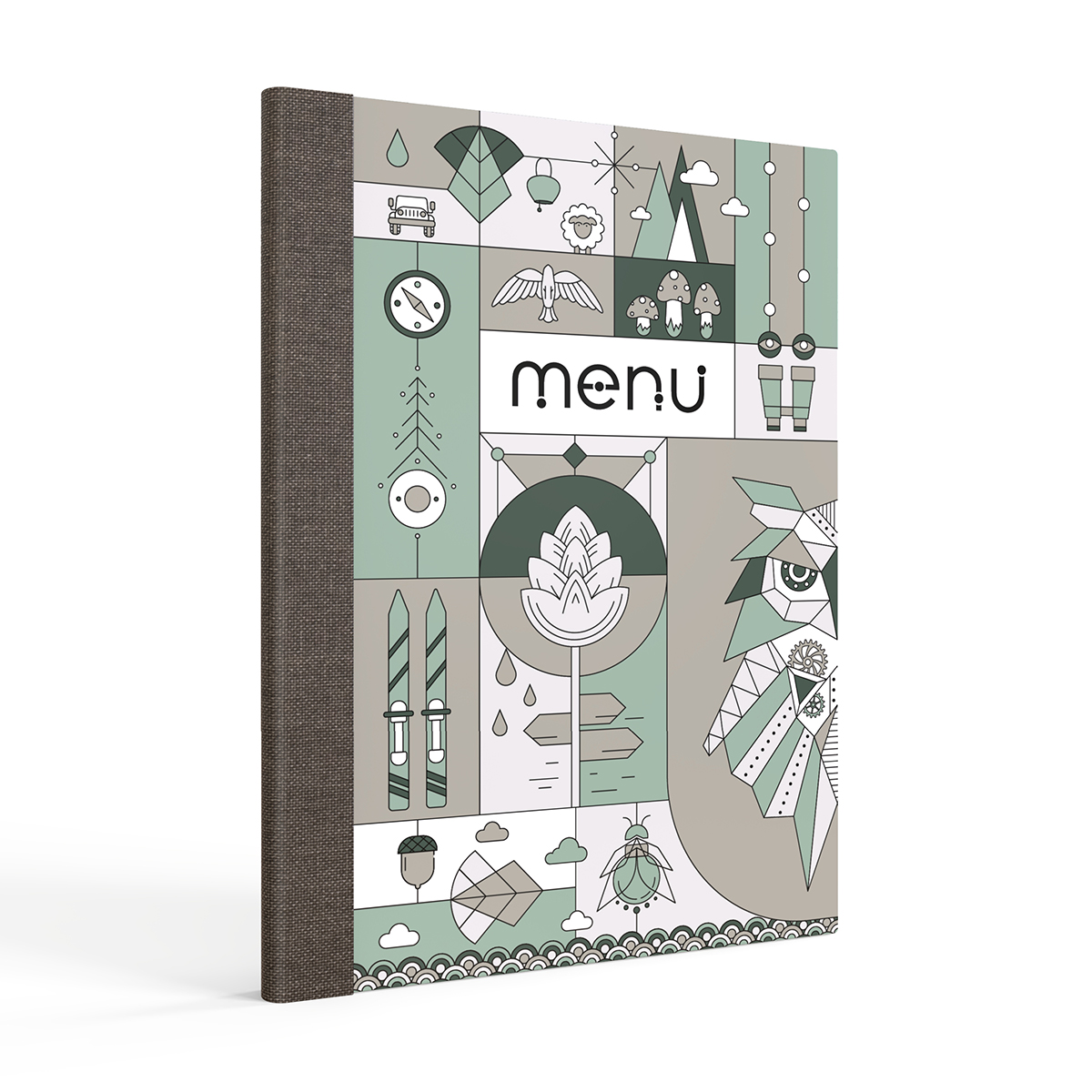 Menu Holder covered with digital printing and leather on the back, in dimension A4 (22cm X 32cm)
